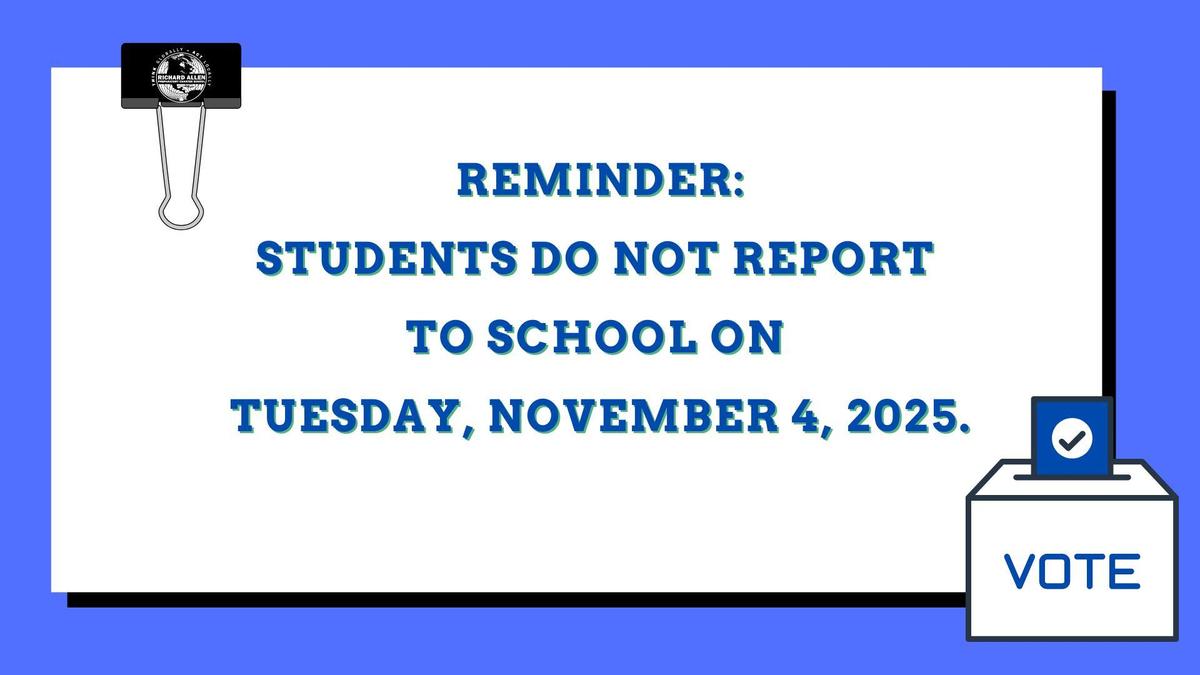 As a reminder, RAPCS students will not report to school on Tuesday, November 4, 2025 in observance of Election Day and due to scheduled staff professional development. Thank you.